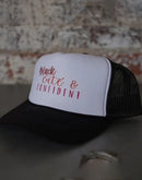 Step into style with our captivating black and white hat featuring vibrant orange accents.